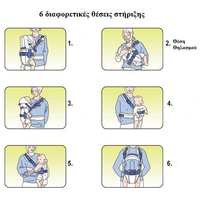 - Παρέχει τη δυνατότητα τοποθέτησης του μωρού σε θέση είτε "πρόσωπο με πρόσωπο" είτε "πρόσωπο προς τα εμπρός" που επιτρέπουν την άμεση επικοινωνία με το γονέα ή την παρατήρηση του γύρω περιβάλλοντος.