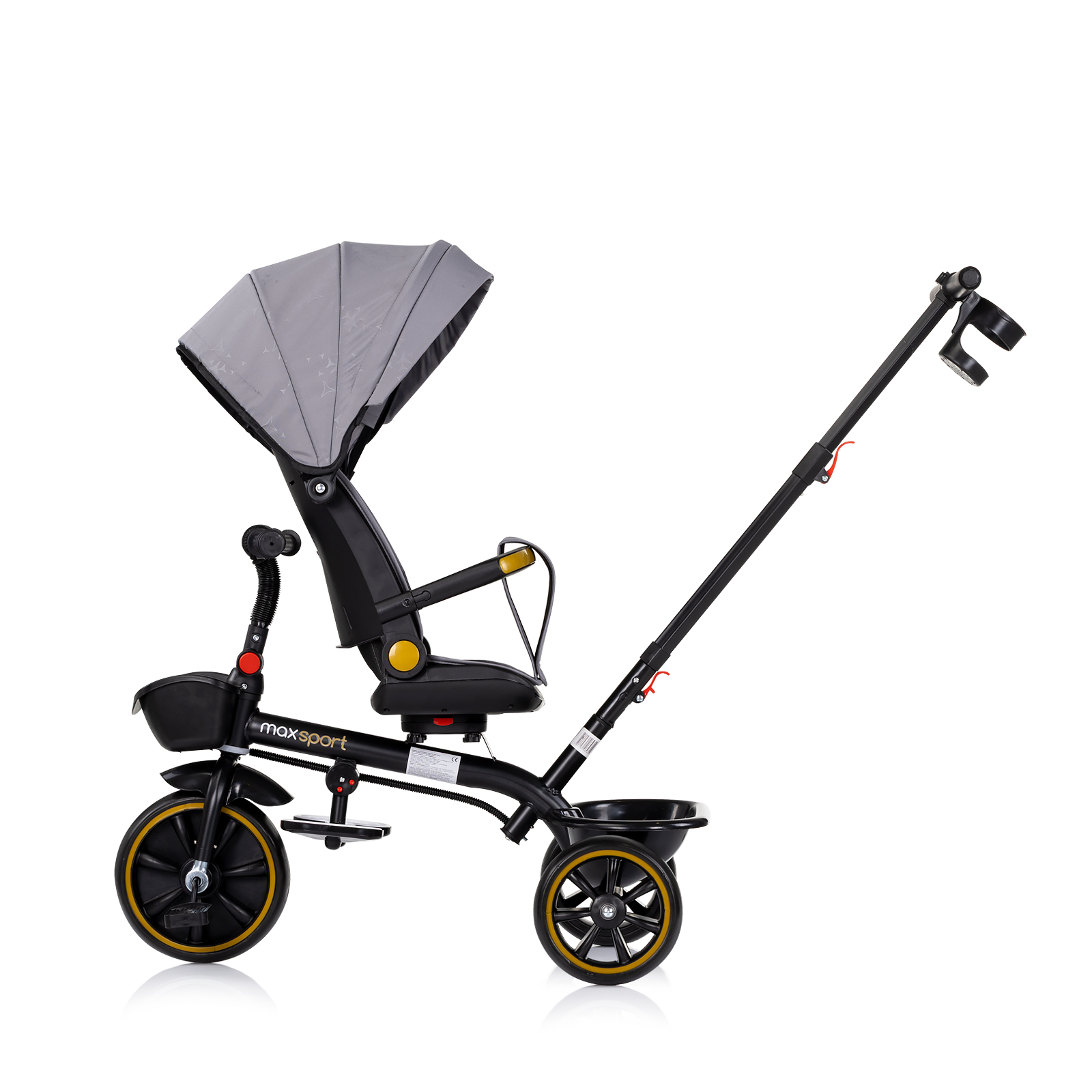 Το Chipolino Max Sport είναι πολυχρηστικό τρίκυκλο με τέντα που χρησιμοποιείται με γονεϊκή ώθηση ή με πετάλια από το παιδί. Διαθέτει περιστρεφόμενο κάθισμα 360°, ανάκλιση, ζώνη ασφαλείας, αφαιρούμενη μπάρα προστασίας και αποθηκευτικά καλάθια μπροστά/πίσω.