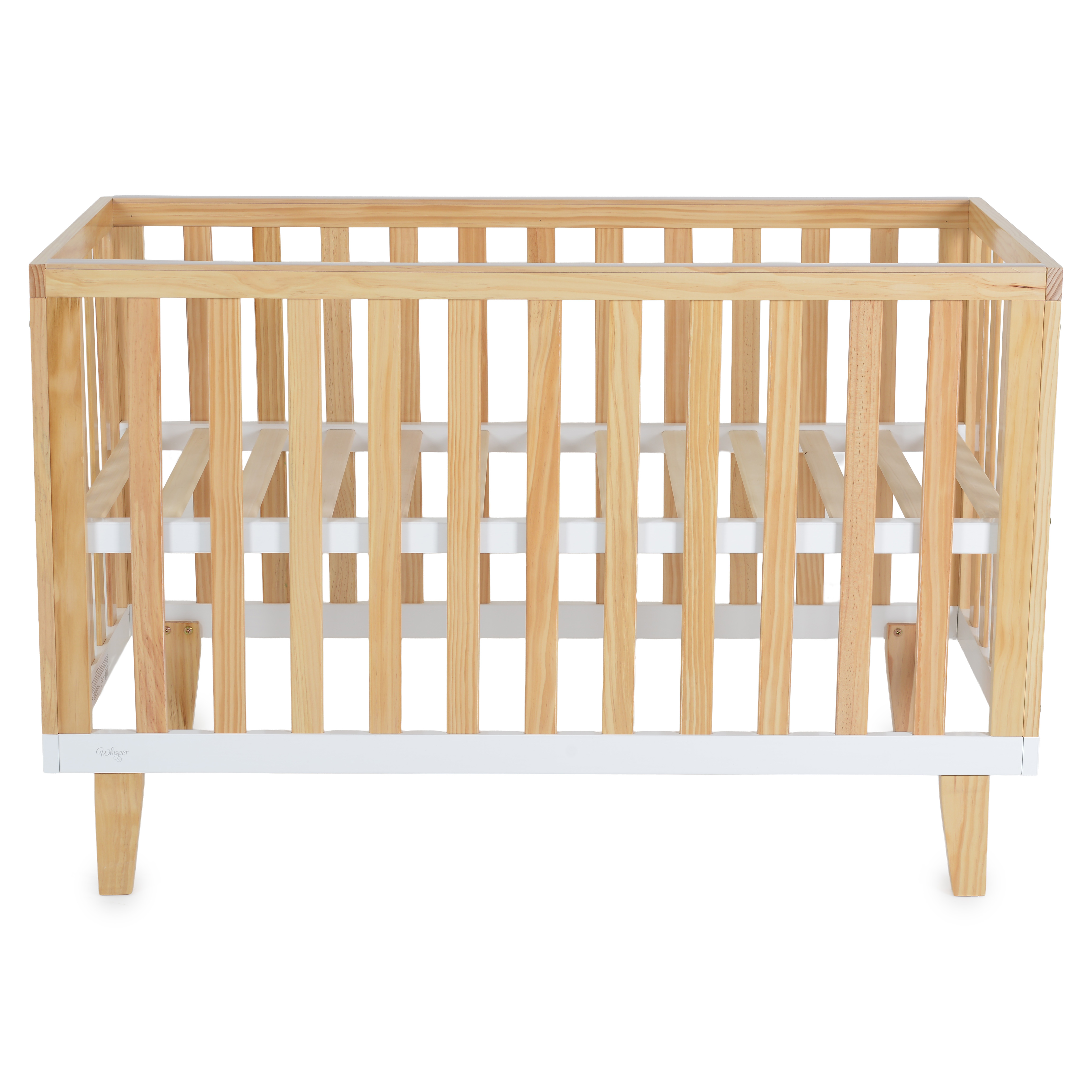 Ξύλινη βρεφική κούνια Cangaroo Whisper από μασίφ ξύλο πεύκου, με λιτό και κομψό design και 3 επίπεδα ρύθμισης ύψους στρώματος. Με στρογγυλεμένες άκρες, ασφαλείς αποστάσεις στα κάγκελα και καλή κυκλοφορία αέρα για άνετο, ήρεμο ύπνο.
