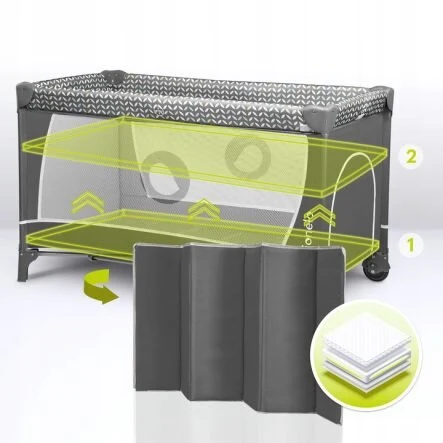 Παρκοκρέβατο 2 επιπέδων με μπάρα παιχνιδιών για ξεκούραση, απασχόληση και πρακτική καθημερινή χρήση στο σπίτι ή στο ταξίδι.