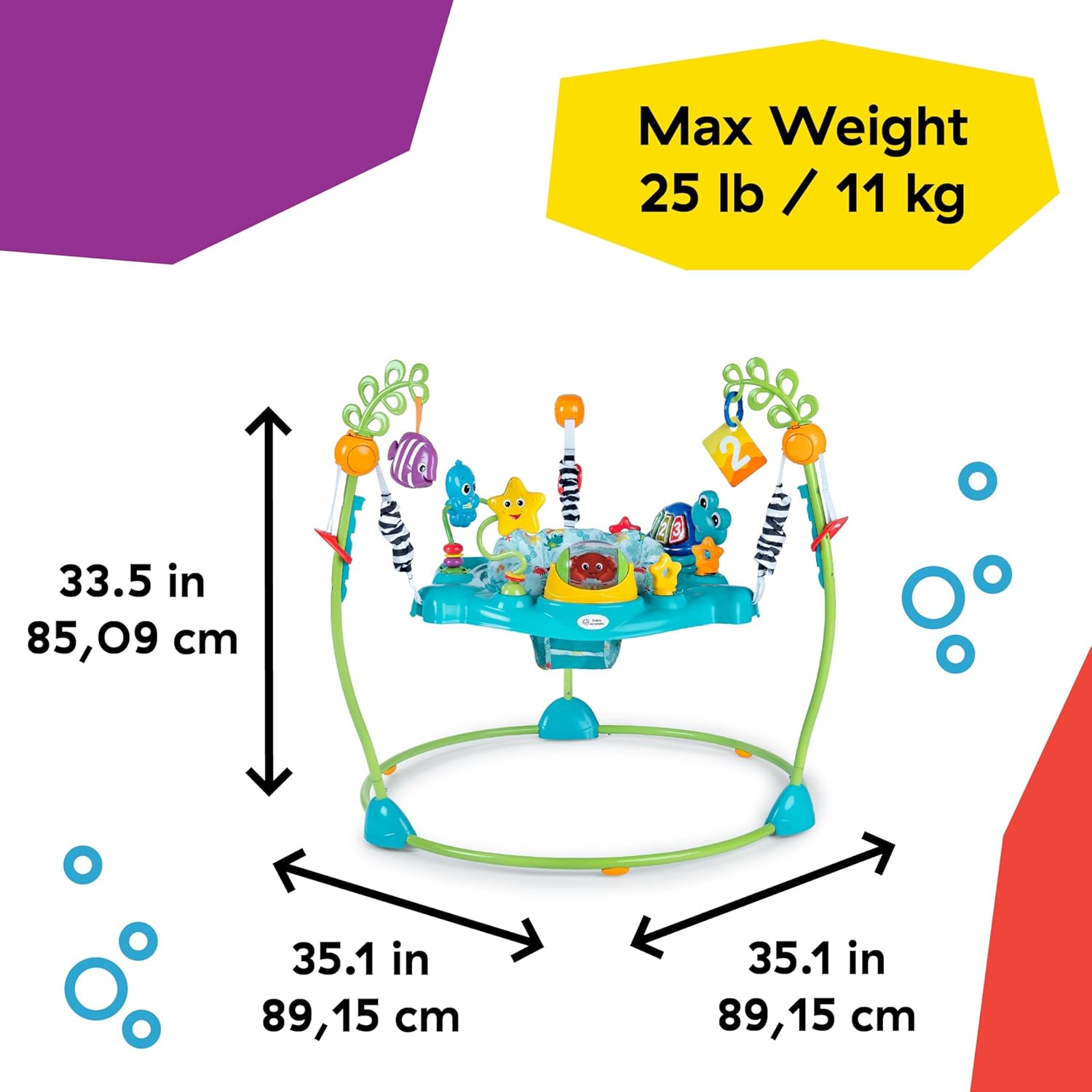 Το κάθισμα περιστρέφεται 360° ώστε το μωρό να έχει πρόσβαση σε όλο το «θαλάσσιο» περιβάλλον παιχνιδιού. Το door hopper ρυθμίζεται σε 4 ύψη και προσαρμόζεται καθώς μεγαλώνει το μωρό.