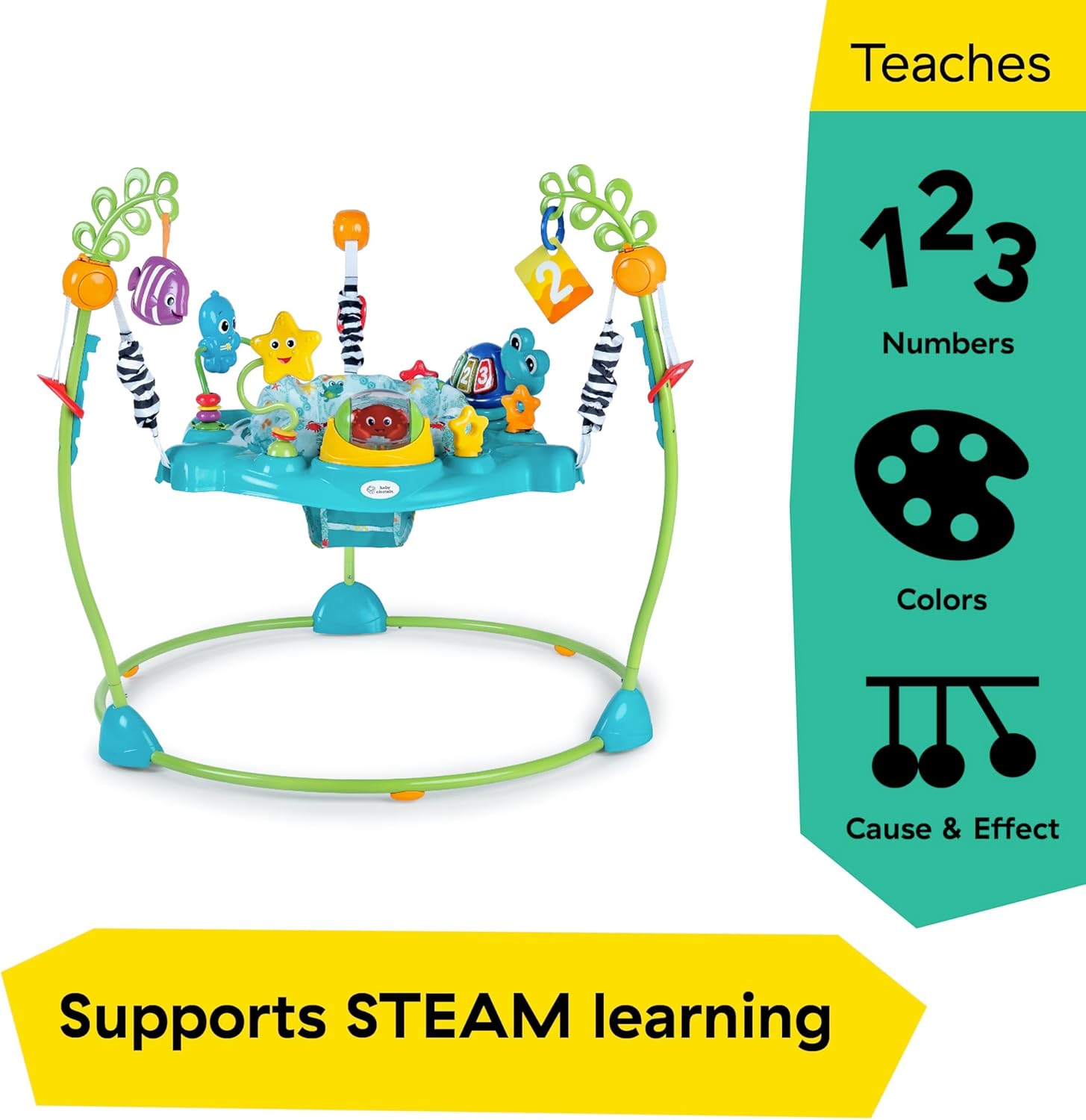 Το Baby Einstein Ocean Explorers Curiosity Cove 2-in-1 είναι ένα διαδραστικό door hopper που μετατρέπεται σε παιχνίδι δαπέδου με αποσπώμενη χελώνα Neptune. Με φώτα, μουσική και ήχους θάλασσας, 3 λειτουργίες μάθησης και 4 γλώσσες, κρατά το μωρό απασχολημένο και ενισχύει τις αισθήσεις του από 6 έως 12 μηνών.