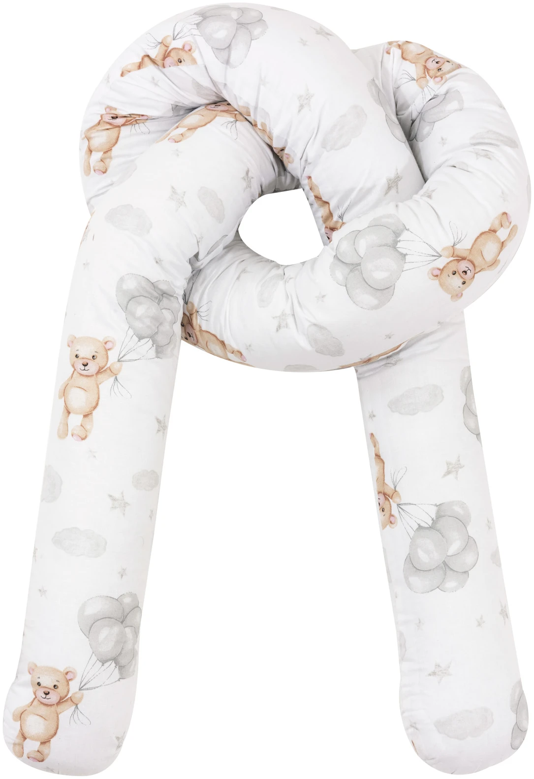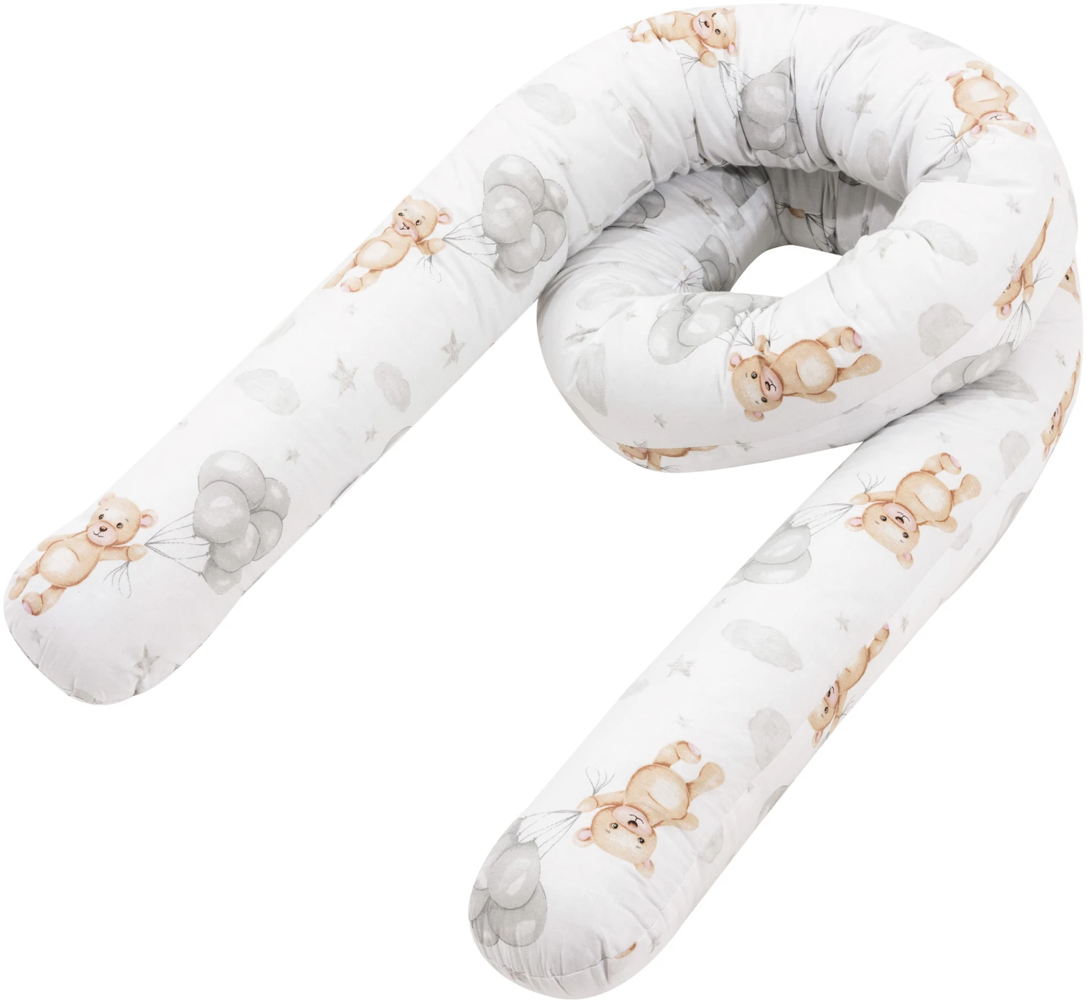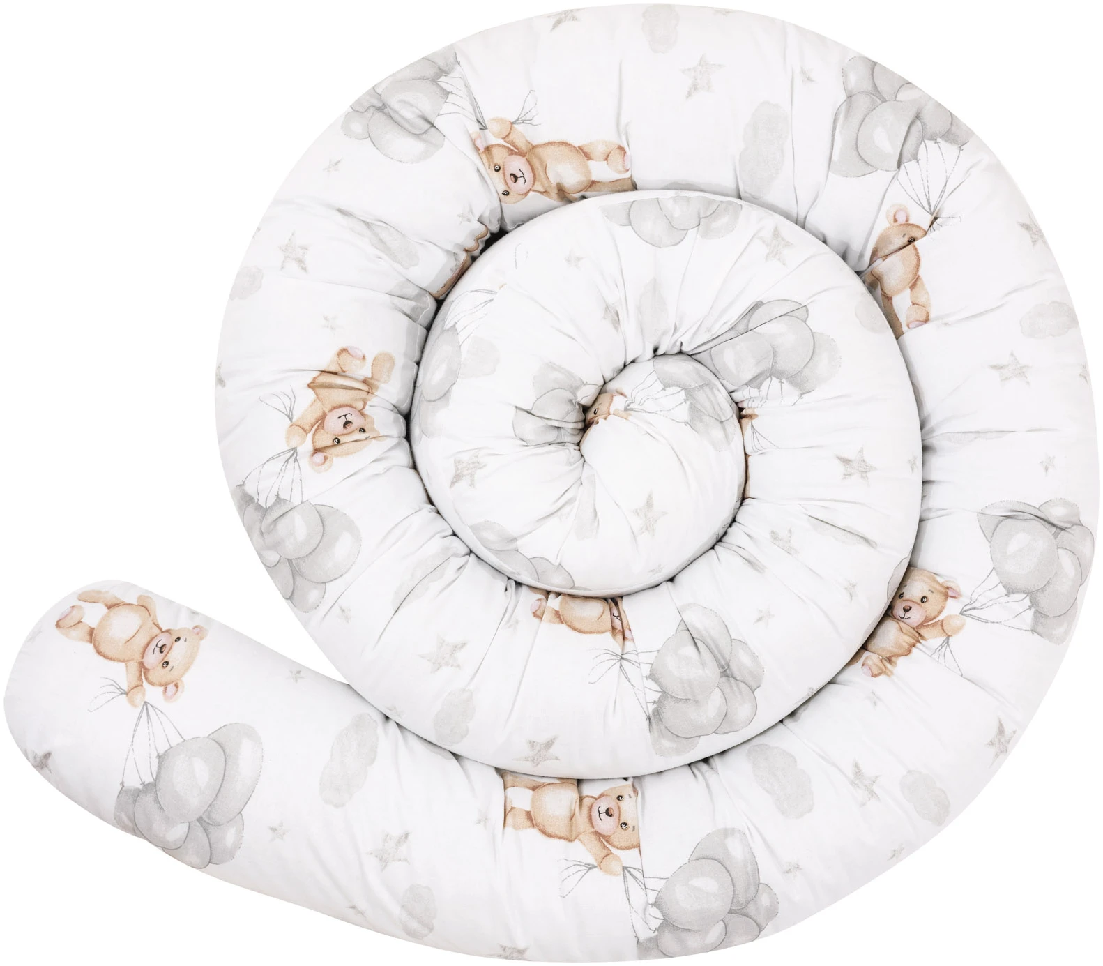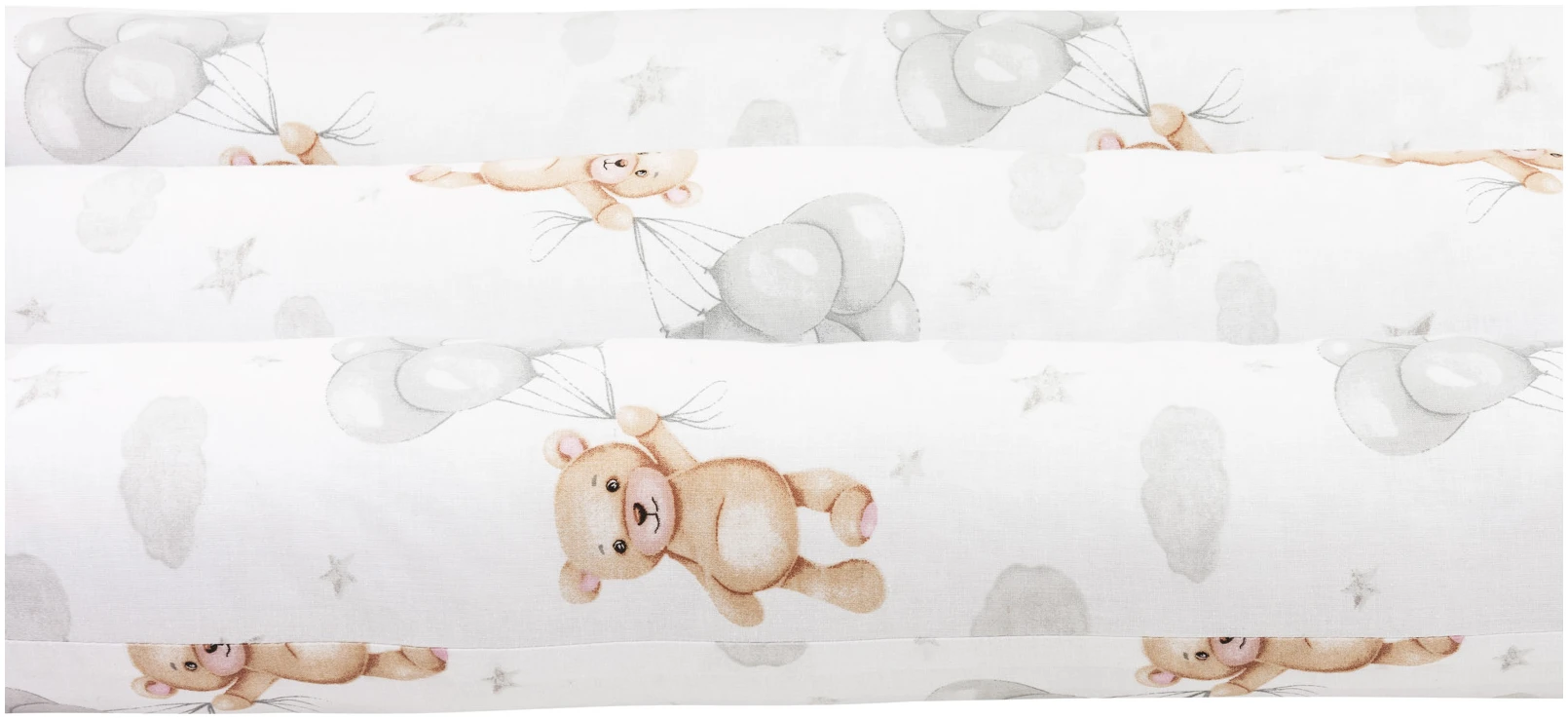 Κυλινδρική πάντα κούνιας JUKKI 300 cm σε σχέδιο Cloudy Bears, για προστασία από χτυπήματα και αποφυγή πίεσης χεριών/ποδιών στα κάγκελα. Με 100% βαμβακερό εξωτερικό ύφασμα και αναπνεύσιμο γέμισμα για άνετο, ασφαλές ύπνο.