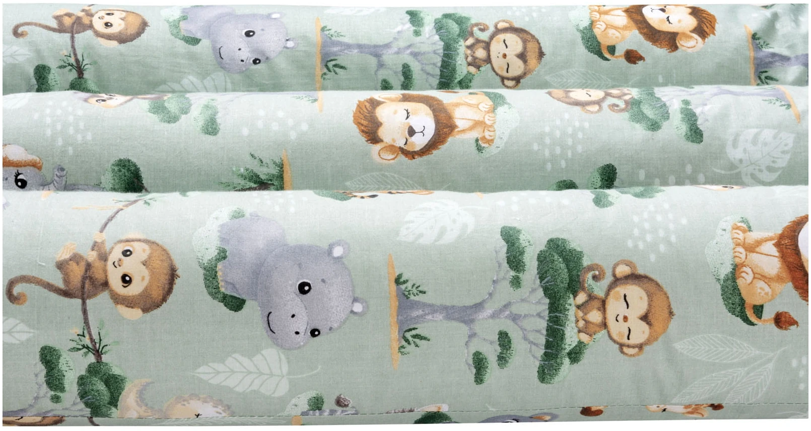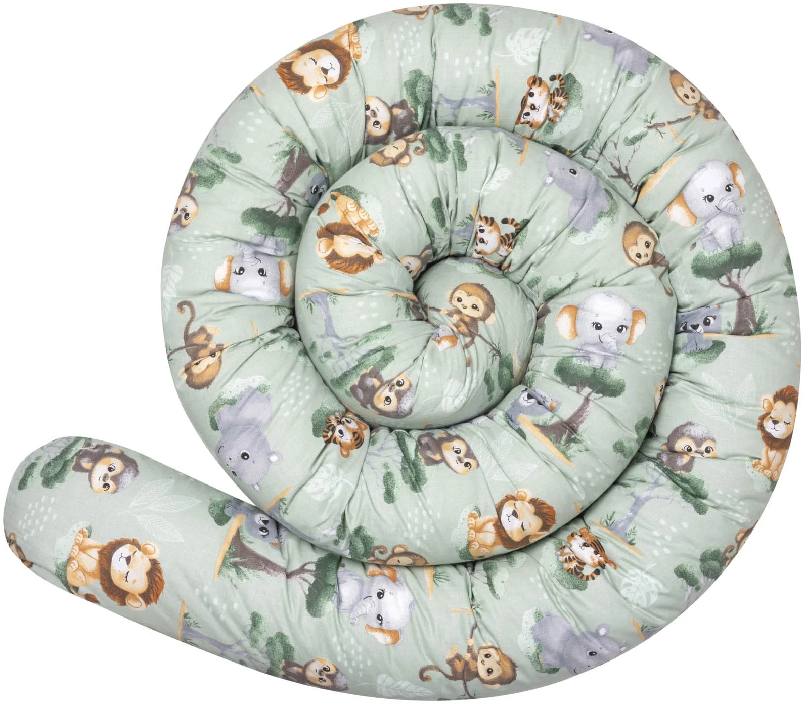 Κυλινδρική πάντα κούνιας JUKKI 300 cm σε σχέδιο Tropical Animals, για προστασία από χτυπήματα και αποφυγή πίεσης χεριών/ποδιών στα κάγκελα. Με 100% βαμβακερό εξωτερικό ύφασμα και αναπνεύσιμο γέμισμα για άνετο, ασφαλές ύπνο.