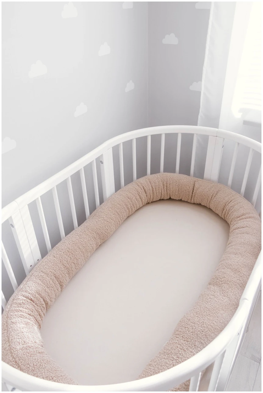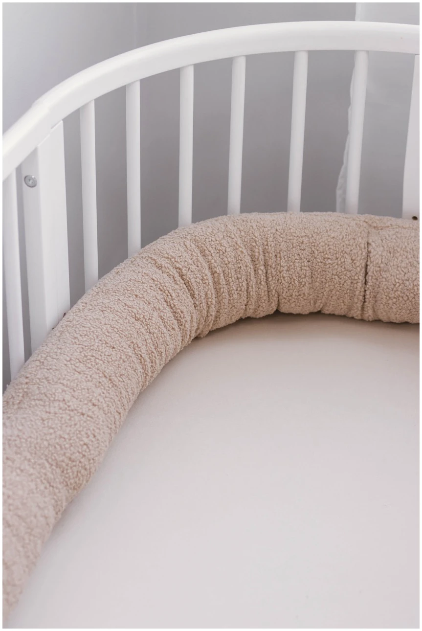 Κυλινδρική πάντα κούνιας JUKKI 300 cm σε Μπεζ Βελουτέ (μπουκλέ), για προστασία από χτυπήματα και αποφυγή πίεσης χεριών/ποδιών στα κάγκελα. Με μαλακή αίσθηση και αναπνεύσιμο γέμισμα, ιδανική για άνετο και ασφαλές ύπνο.