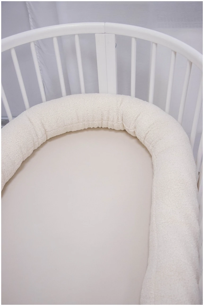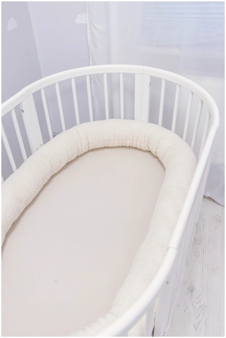 Κυλινδρική πάντα κούνιας JUKKI 300 cm σε Εκρού Βελουτέ (μπουκλέ), για προστασία από χτυπήματα και αποφυγή πίεσης χεριών/ποδιών στα κάγκελα. Με αναπνεύσιμο γέμισμα για άνετο και ασφαλές ύπνο.