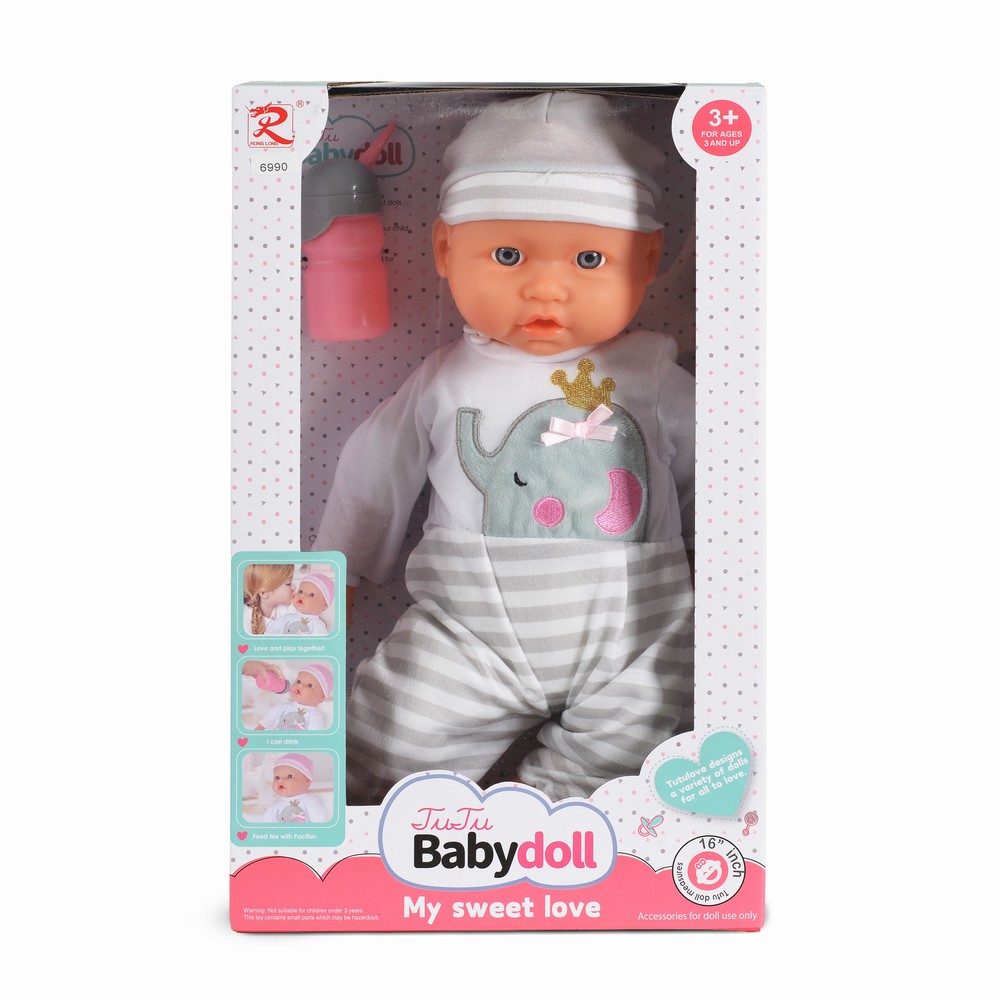 Γλυκιά κούκλα Moni 41 cm με ρουχαλάκια με σχέδιο ελεφαντάκι, καπελάκι και μπιμπερό. Ιδανική για παιδιά 3+ για παιχνίδι ρόλων και ανάπτυξη δεξιοτήτων φροντίδας.