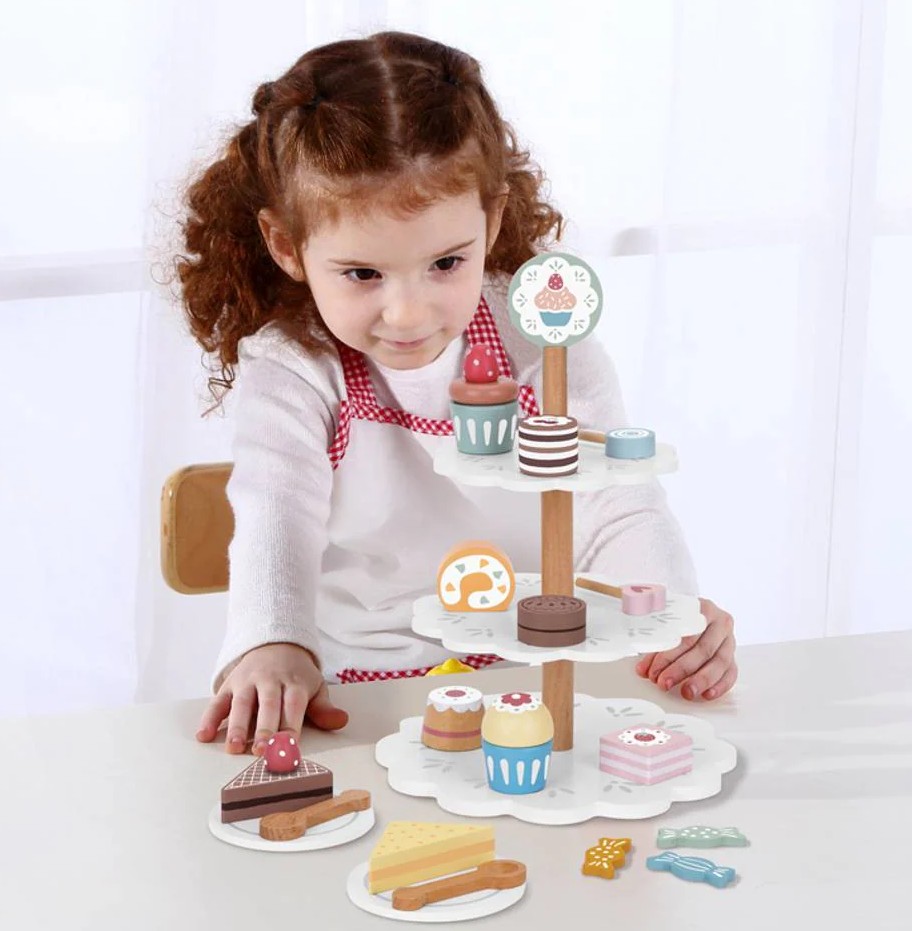 Το Tooky Toy TJ273 – Ξύλινος Δίσκος Γλυκισμάτων είναι ένα καλαίσθητο και διασκεδαστικό παιχνίδι ρόλων που ενισχύει τη δημιουργικότητα και την κοινωνική αλληλεπίδραση των παιδιών. Περιλαμβάνει έναν τριώροφο δίσκο παρουσίασης, μενού, ξύλινα γλυκίσματα και εργαλεία σερβιρίσματος.