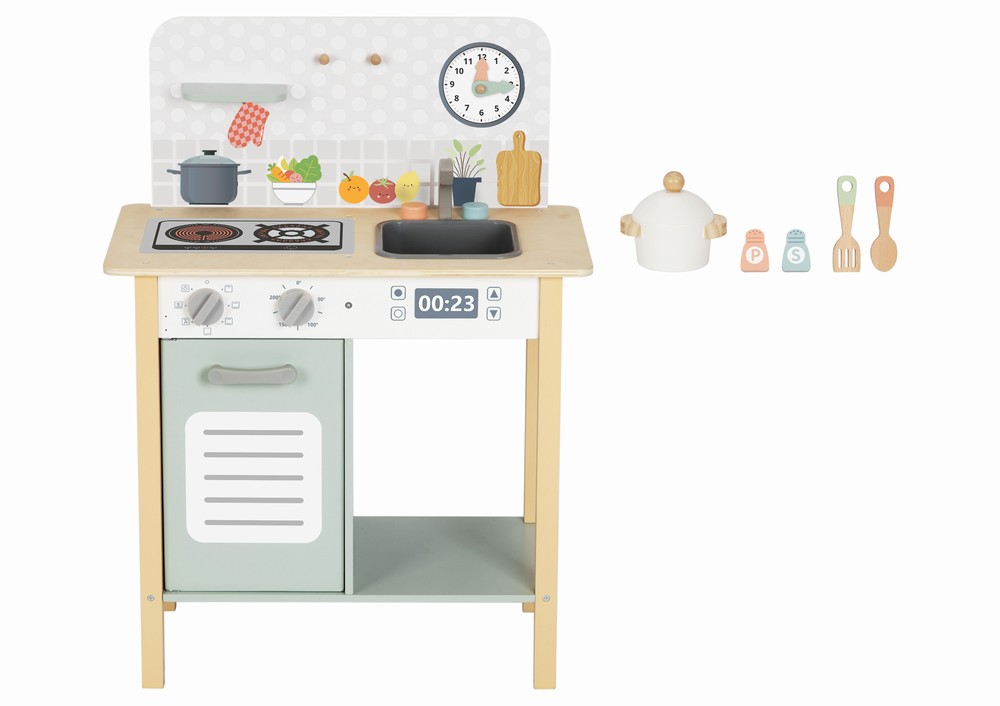- Πλήρες σετ αξεσουάρ που περιλαμβάνει βασικά εργαλεία κουζίνας για παιχνίδι ρόλων.