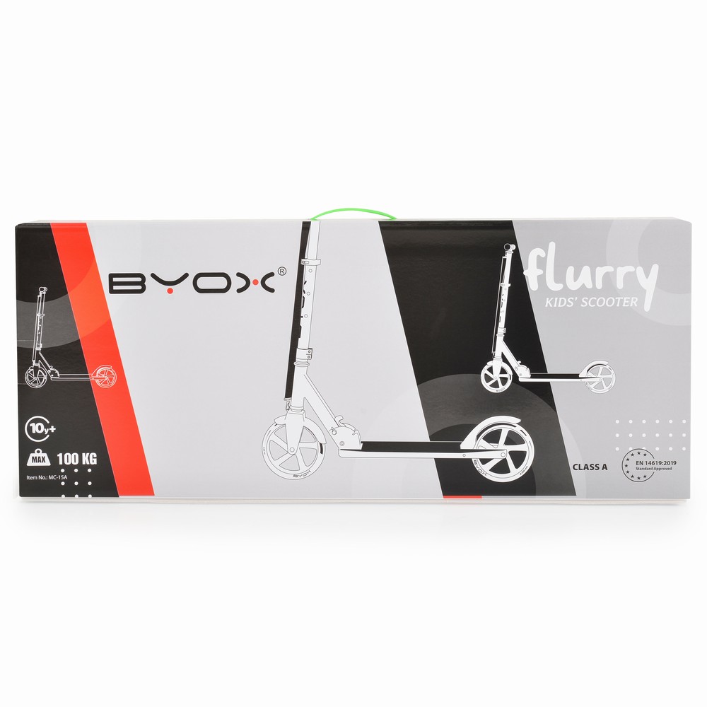 Το Byox Flurry Pink είναι πατίνι για παιδιά 8+ με μέγιστο βάρος 100 kg, αλουμινένιο πλαίσιο, τροχούς PU 200×30 mm, αναδιπλούμενο σχεδιασμό και ρυθμιζόμενο τιμόνι 78–97 cm.