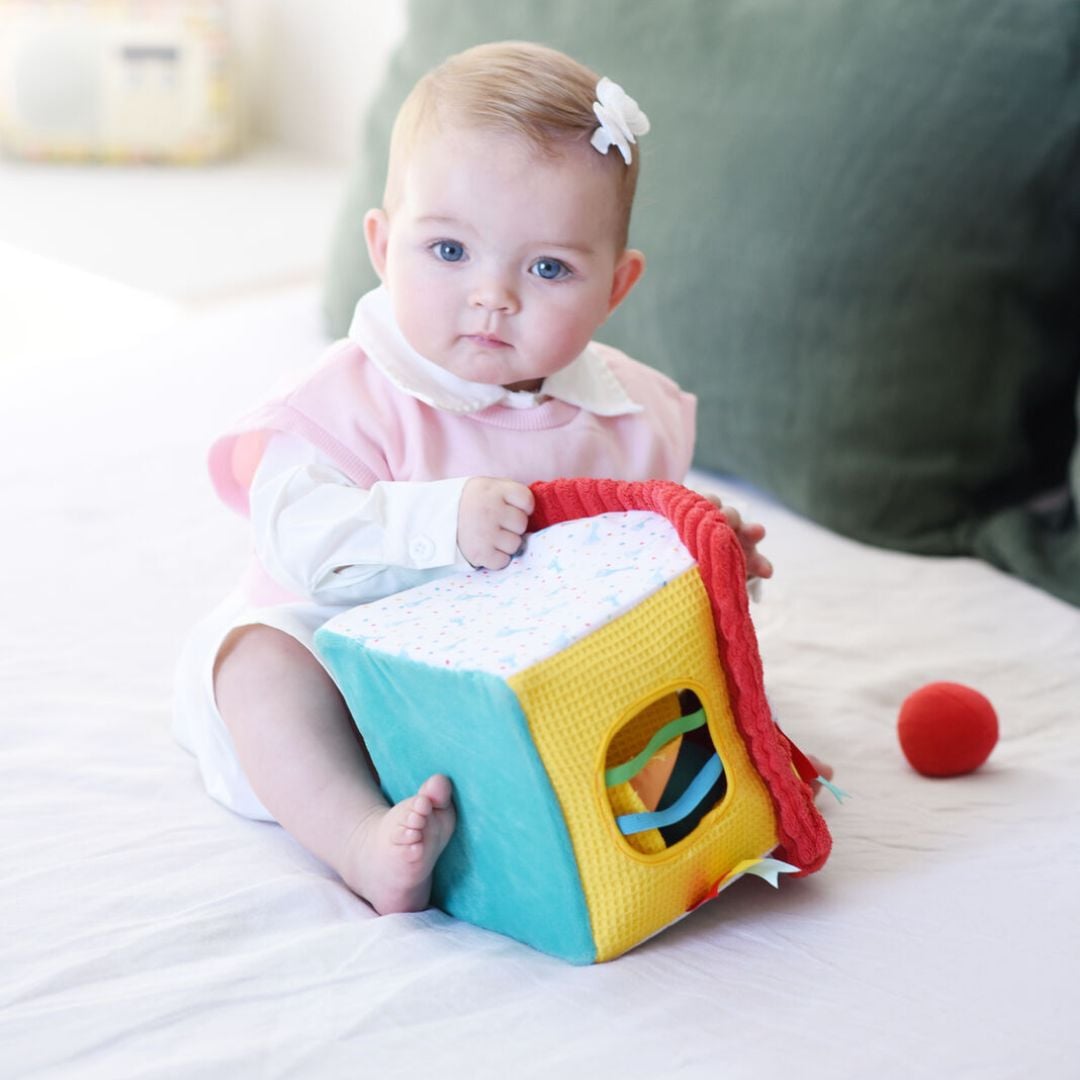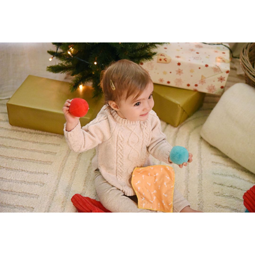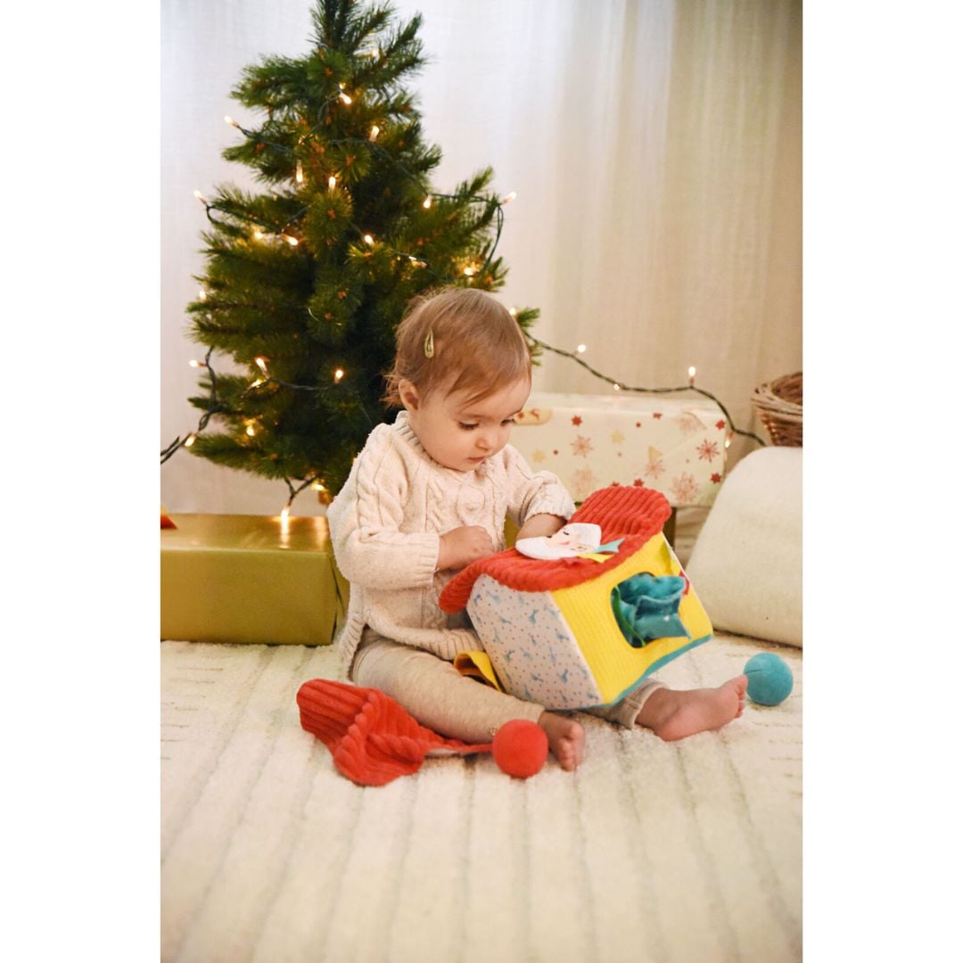 Το μωρό μπορεί να ανακαλύψει κρυψώνες, να πιάσει και να μετακινήσει 3 μαλακές μπάλες, καθώς και να εξερευνήσει 3 υφασμάτινα πανάκια με διαφορετικές υφές. Οι ποικίλες επιφάνειες, τα έντονα χρώματα και τα ηχητικά ερεθίσματα βοηθούν στην ανάπτυξη της αισθητηριακής αντίληψης, της λεπτής κινητικότητας και του συντονισμού χεριού-ματιού.