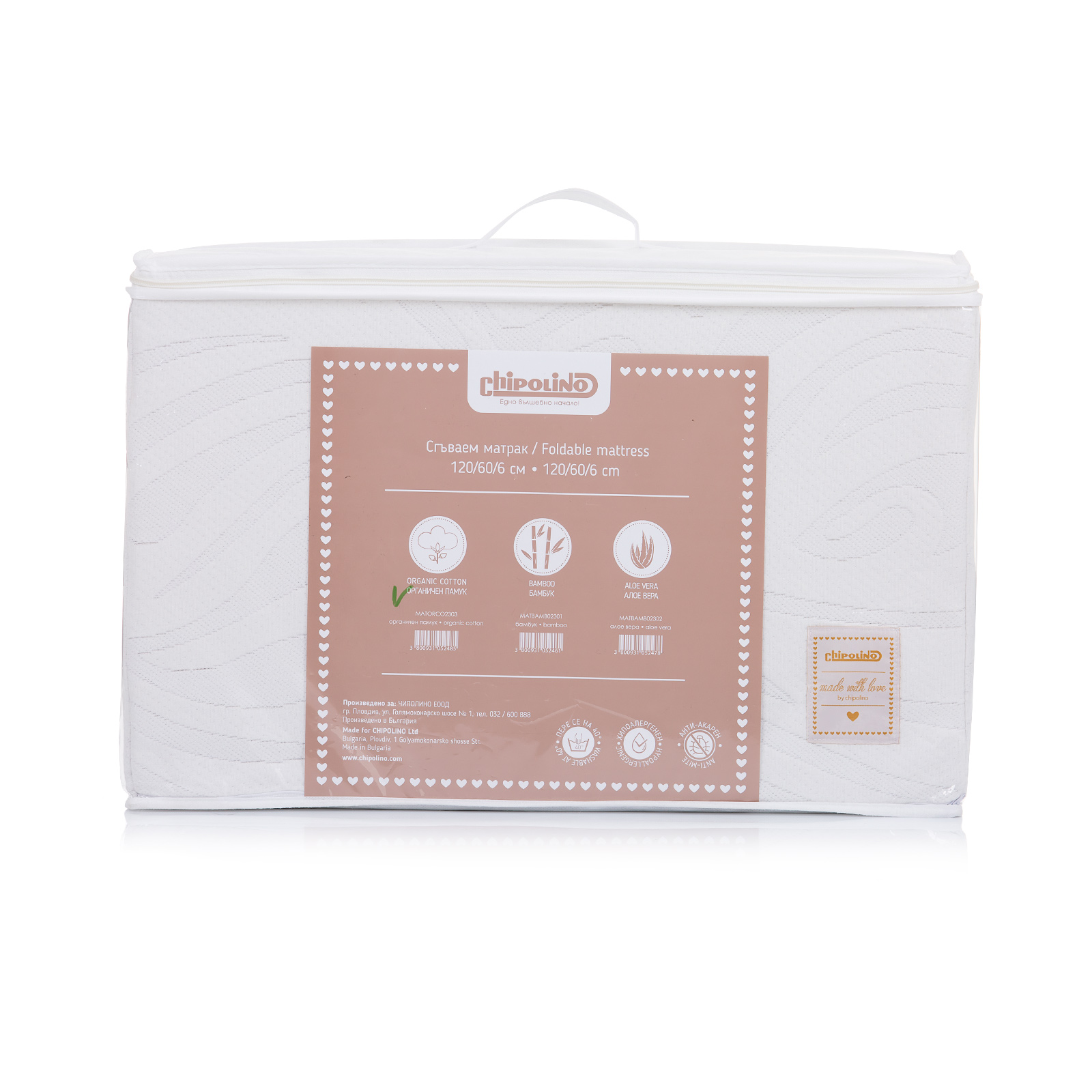 Foldable mattress, designed with care for comfort and health of your baby. The core is made of high-quality polyester foam, which has excellent orthopedic characteristics combined with high strength and elasticity. The cover is made of organic cotton, which is used to make premium bedding. Products made from organic cotton are generally considered high-end and are softer than regular cotton because of the longer fibers. Organic cotton is produced from natural seeds and no pesticides or other harmful chemicals are used. As a result, organic cotton products are safer for the skin. Organic cotton is softer, hypoallergenic and lasts longer time, but the most important benefit is protecting the ecosystem, reducing wastewater and providing a safer environment.