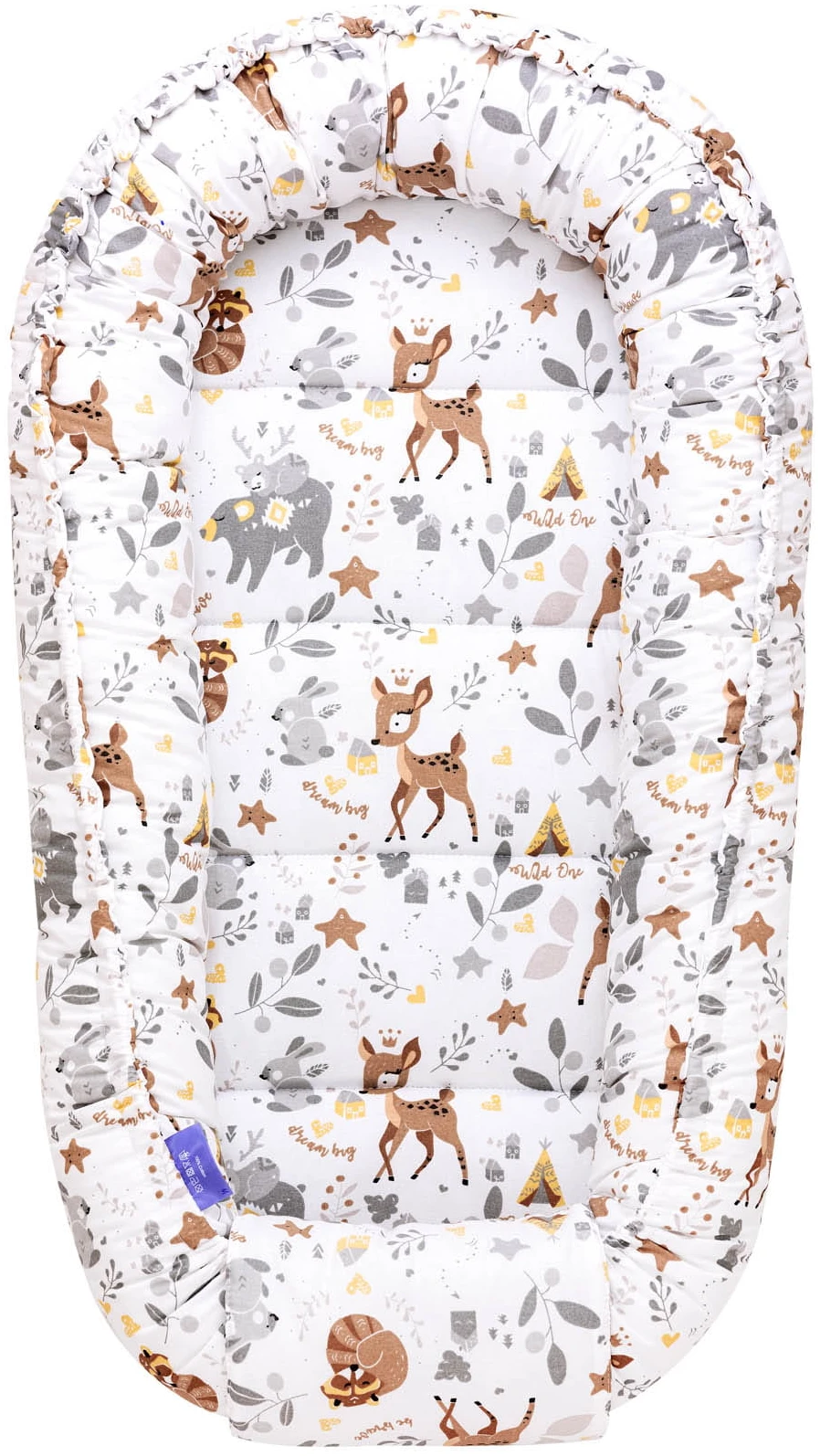 in the parents' bed – the nest provides a safe space for the baby, prevents it from rolling, bumping or getting under the duvet (especially recommended for mums who sleep with their baby),