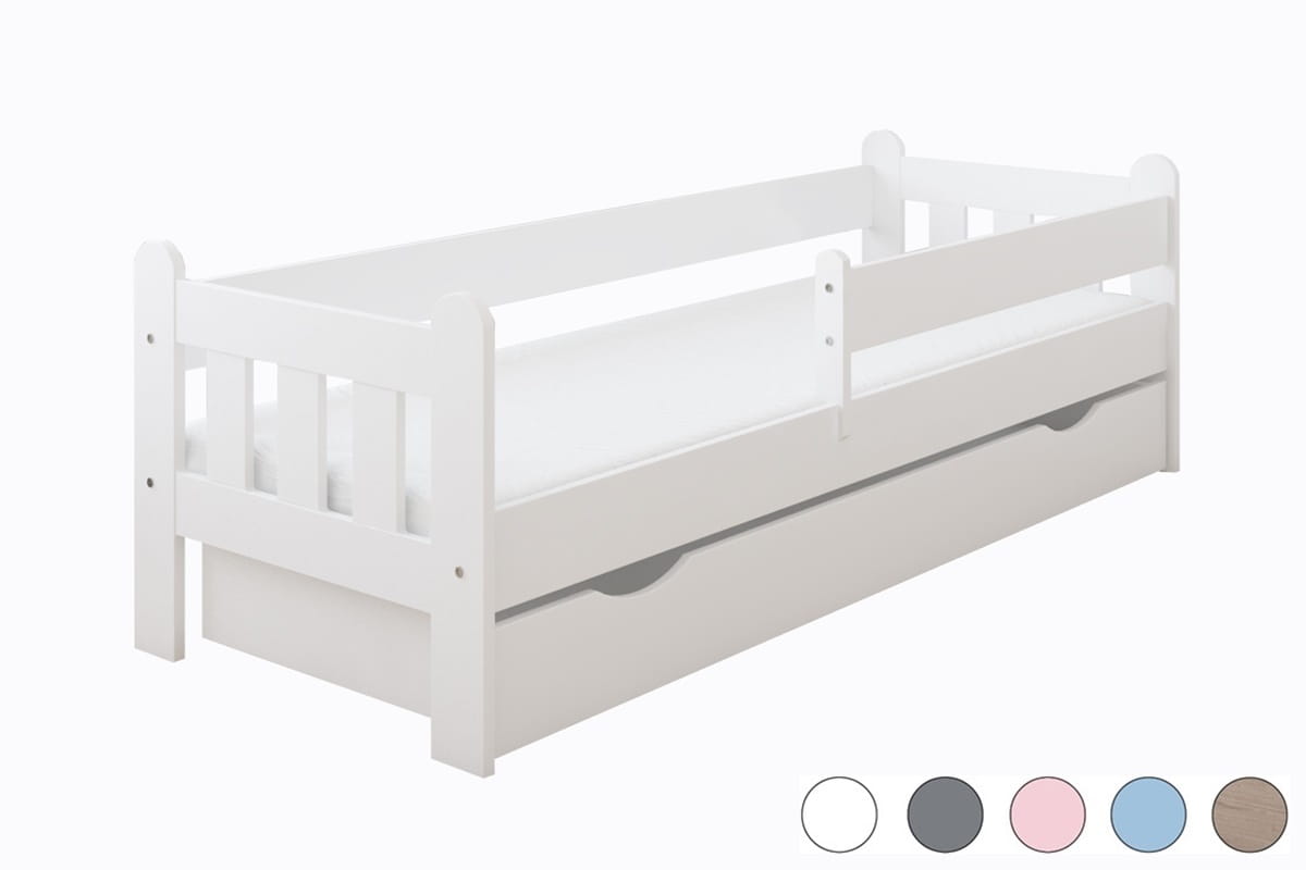 Two side protections and a low mattress position will ensure your child's safety and comfort of use. The bed is double-sided, which means that the barrier can be mounted on the right or left side, depending on your needs. The bed also includes a spacious drawer on wheels, which can be used as a container for bedding or for your child's toys.