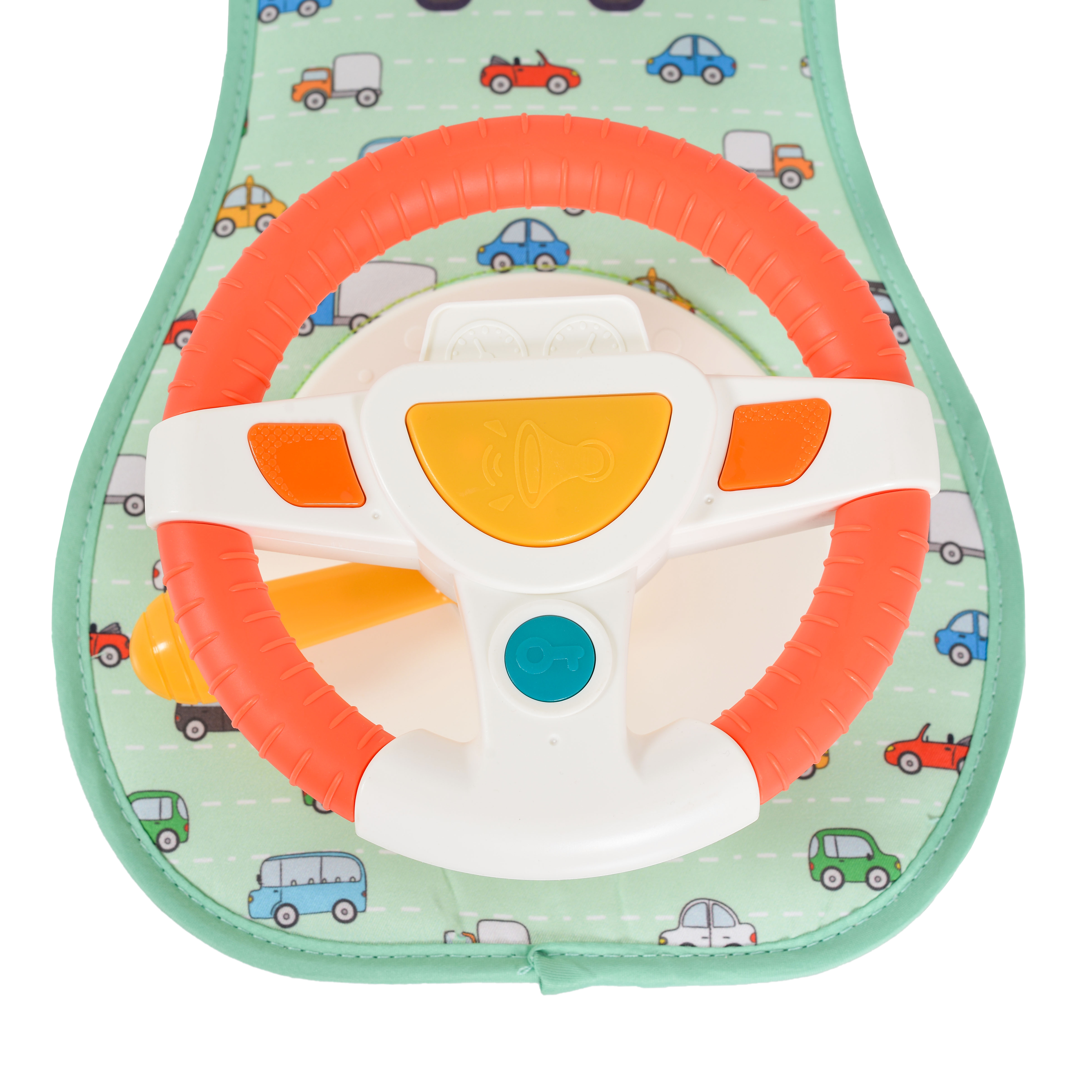 The Moni Baby Pilot HE0623 is an interactive car toy that attaches to the back of the front seat and is intended for children 18+ months using a forward-facing car seat. It features realistic car sounds, melodies, flashing lights and a safe mirror, stimulating sensory development and imaginative play during travel.