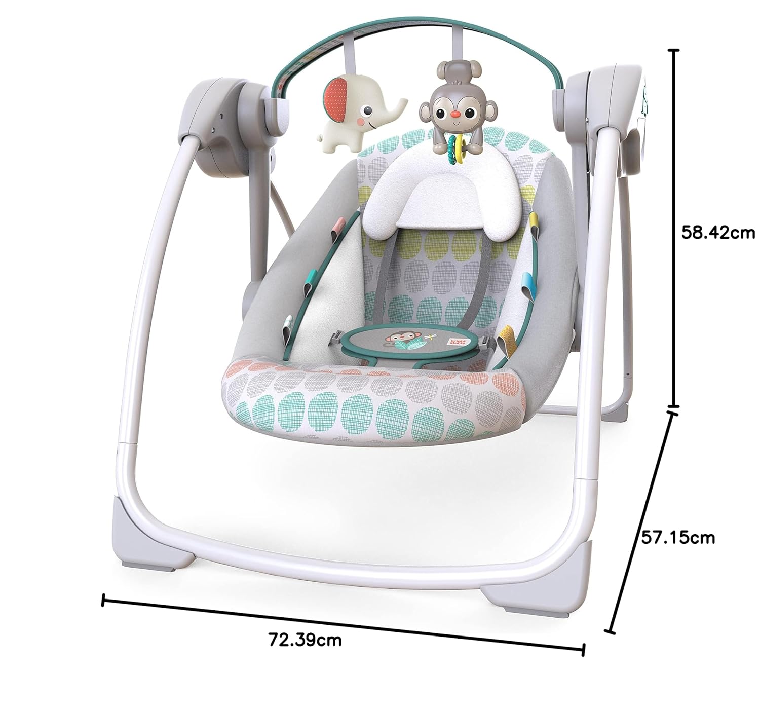 The Bright Starts Whimsical Wild swing soothes and entertains your baby with gentle automatic motion, soft melodies, and playful animal friends. Safe, portable, and cozy, it provides comfort and joy both at home and on the go.